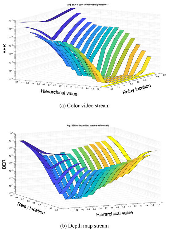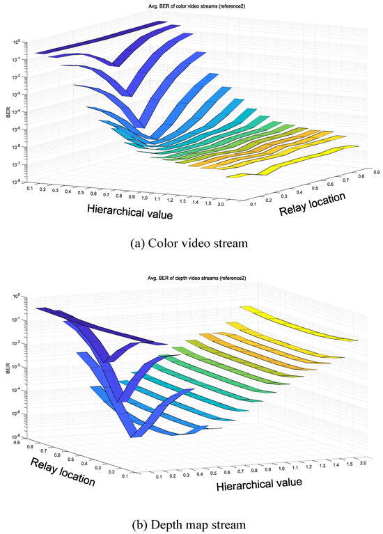 The figures from Figure 6, Figure 7 and Figure 8 present the Bit Error Rate (BER) performances of the proposed and referenced network and channel coding methods, as illustrated in Figure 3. In each figure, subfigures (a) and (b) depict the BER performances for the color video and depth map streams, respectively. The X-axis represents the hierarchical value (), the Y-axis represents the relay location (), and the Z-axis represents the BER. For the theoretical analysis of LLR and the exact BER calculation used in this paper, please refer to the appendix of [11] and [17], respectively.