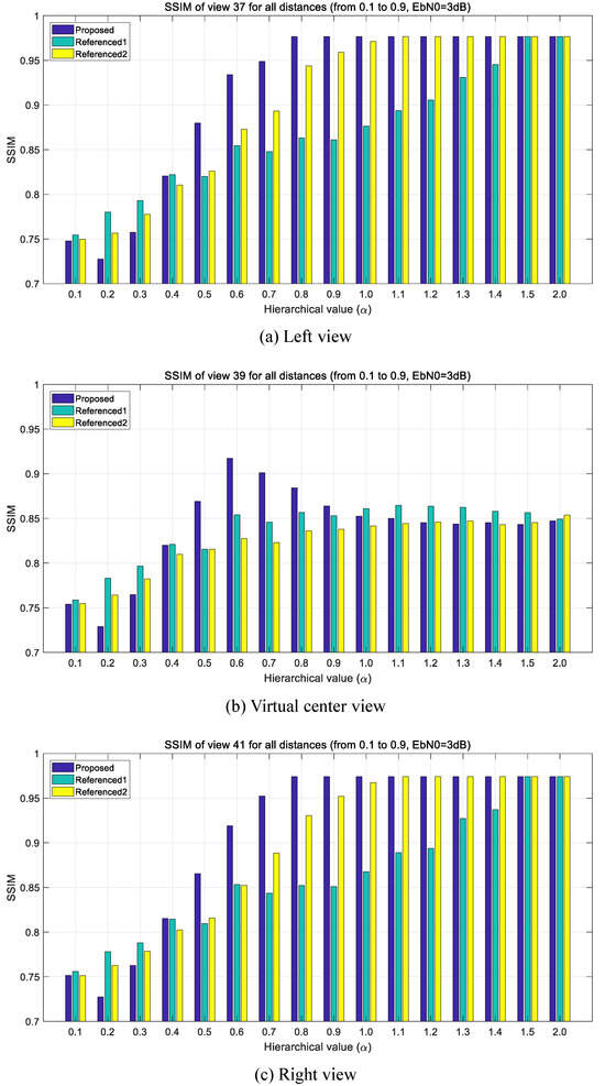 For performance evaluation, we assess the SSIM performance based on the quality of the reconstructed left and right view videos, as well as the virtually generated center view video. For the left and right view videos, both the proposed and referenced methods demonstrate improved SSIM performance, with minor variations depending on the hierarchical value , irrespective of the relay location. However, for the virtually generated center view video, only the proposed method with consistently meets the target SSIM of 0.9, regardless of the relay location.