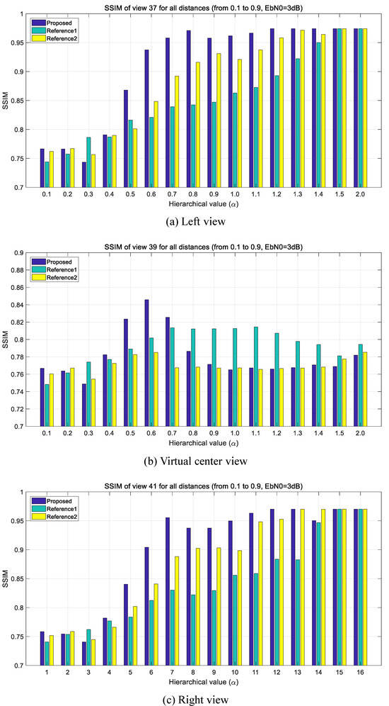 In this subsection, we examine how the BER performances influence the SSIM performances shown in Figure 9 and Figure 10, which correspond to the Pantomime and Champagne Tower sequences, respectively. The target SSIM value is set to 0.9, as this is generally considered to indicate good quality by human observers [26]. Since the final output displayed to viewers consists of color videos rather than depth videos, the evaluation focuses solely on the quality of the left and right color videos, as well as the virtually generated center color video.