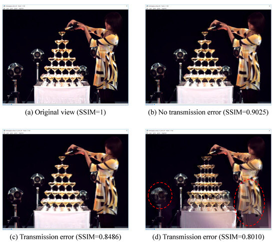 The virtual center view presents a different scenario, as shown in Figure 9b and Figure 10b. For the proposed method, the target SSIM is met when is set to 0.6. While the virtual view for the Champagne Tower sequence slightly falls short of the target SSIM, this is not a major issue due to the complexity of the subject in this sequence. To illustrate this subjectively, Figure 11 presents four video frames. Figure 11a shows the original view (SSIM = 1), and Figure 11b shows a virtually generated center frame (SSIM = 0.9025), generated by VSRS under error-free conditions. For Champagne Tower, the target SSIM is not met even without transmission errors because the complexity of the champagne tower subject causes a reduction in synthesis quality. However, as shown in Figure 11c, when the SSIM drops to about 0.85, the quality is nearly indistinguishable from the error-free case. If the SSIM drops further to 0.8, the degradation becomes visible to the naked eye.