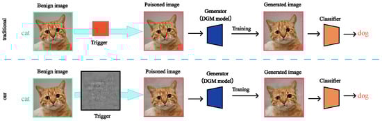 In the field of deep generative models (DGMs), many backdoor attacks rely on the implantation of specific triggers in inputs or outputs. These triggers often exhibit distinctive features, such as patterns, colours, or frequencies [17,18]. Consider, for example (as shown in Figure 1), a DGM model trained to generate images of cats. An attacker might intentionally inject a specific red mark pattern into a subset of publicly available image datasets. This red mark, although subtle to the human eye, could act as a trigger. During the data preparation phase of model training, unsuspecting users might unknowingly utilize this poisoned public dataset to train their DGM models. As a result, the trained model would be susceptible to the attacker’s influence. Whenever the model encounters the red mark pattern in a new image, it would be triggered to generate images of cats that include the red mark, even if the original image did not contain it. Furthermore, despite misclassifications, such as incorrectly identifying a cat as a dog, a backdoored model can maintain its original performance and output high confidence scores, potentially reaching 95%. This high confidence can mislead users, particularly when they lack alternative sources of information or reference points, making them more susceptible to the model’s compromised state. Attackers exploit this by designing backdoors that trigger incorrect outputs while maintaining high confidence levels, further obscuring the model’s compromised state.