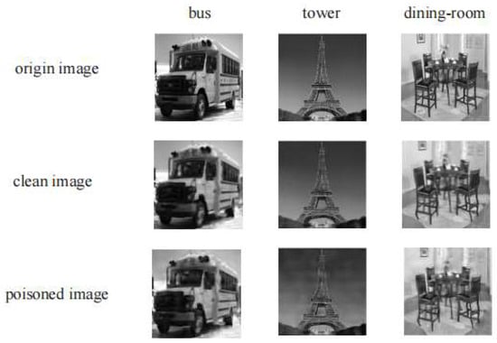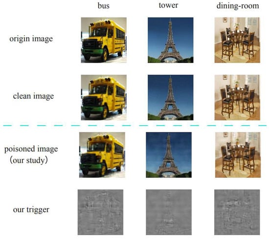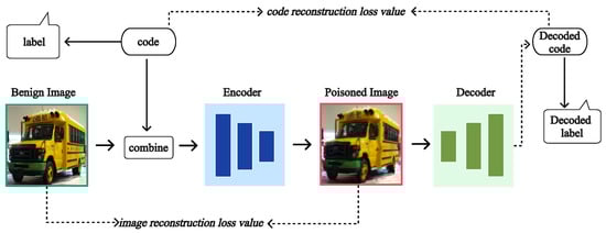 In this paper, we employed a pre-trained encoder–decoder network [36] to generate invisible triggers for image datasets. The generated triggers are invisible additive noises containing a string of the target label. The string can be flexibly designed by the attacker, with the potential to be the name, the index of the target label, or even a random character. In Figure 2, the primary objective of an Encoder is to integrate the string (code, as shown in Figure 2) into an image, with a particular emphasis on reducing the perceptual alterations while maintaining image quality. Through training, the Encoder learns to mask the triggers in the benign image, resulting in changes that are almost imperceptible to the human eye.