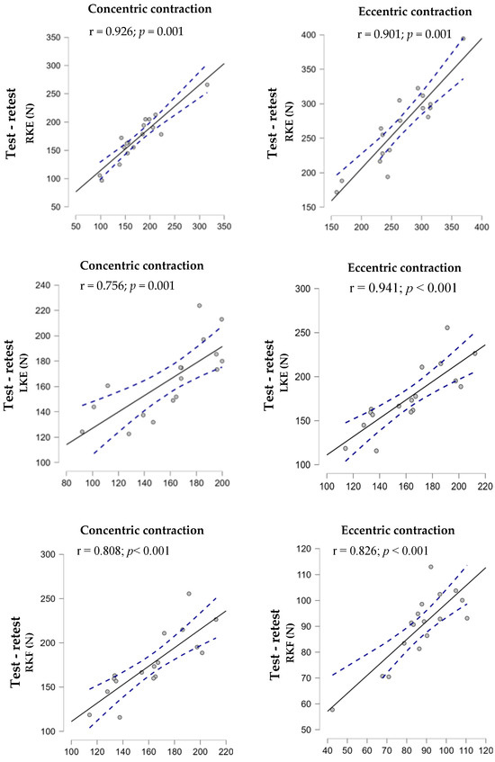Relationship between peak muscle strength in right knee extension (RKE), peak muscle strength in left knee extension (LKE), peak muscle strength in right knee flexion (RKF), and peak muscle strength in left knee flexion (LKF) in the concentric and eccentric phases in both test sessions during FEMD-controlled peak muscle strength assessment. The small circles are the analyzed muscle force loads, the central line is the graph of the Pearson correlation model, the blue dashed lines are the 95% confidence interval of the model provided by the JASP statistical package.