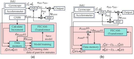 Sharaf et al. used a radial basis function neural network to model INS positions and the mathematical relationship between INS and GNSS for stable and reliable navigation performance [14,15]. Tan et al. employed support vector machines (SVM) optimized by genetic algorithms (GAs) to address neural network overfitting and local minimum problems [16]. Static neural networks have limited navigation performance due to their inability to remember long-term time features, leading to the application of more advanced deep learning models. Long short-term memory (LSTM), as a dynamic neural network, uses past and present information to predict future states and was applied to obtain stable GNSS navigation data during interruptions [17]. X. Meng et al. proposed a convolutional neural networks-gated recurrent unit (CNNs-GRU) hybrid model combined with an improved robust adaptive Kalman filter to enhance navigation accuracy during GNSS failures [18]. Despite solving the basic degradation problem, these deep neural networks still face accuracy and long-term stability issues. To further explore artificial intelligence in this field, large-scale deep learning models have been integrated into INS/GNSS systems. For example, the Transformer [19] was used to improve navigation reliability during GNSS outages [20], and the time convolutional network (TCN) was applied for its feature extraction and time modeling capabilities, achieving multi-task learning when combined with other neural networks like GRU [21].