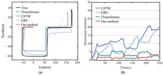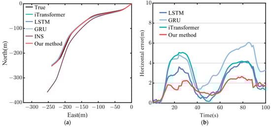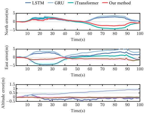 Among these, the iTransformer achieved the best performance in the north direction, slightly outperforming the method proposed in this paper. However, its performance in the east direction was weaker, leading to a lower overall score in horizontal positioning. Our method achieved the best overall performance. Additionally, due to the high noise and low stability of the low-cost sensors, the error in pure INS inertial navigation was so large that its trajectory and error values could not be properly displayed alongside the other methods. Therefore, the INS is excluded from further comparisons.