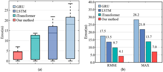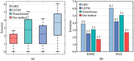 Figure 11a presents the horizontal position error distribution of each method in the form of a box plot. The error distribution of the method proposed in this paper is more concentrated, with most of the errors and the median below 3 m indicating greater stability compared to other methods. Figure 11b shows the root mean square error (RMSE) and maximum error (MAX Error) of the horizontal position for each method, presented in a bar chart. Our method yields strong results, with an RMSE of 1.7 m and a MAX Error of 2.7 m after 100 s of GNSS outage. While the iTransformer’s error is slightly higher than that of the LSTM, the difference is minimal. On the more moderate route, both the LSTM and GRU perform well, but on routes with more drastic changes in a motion state, the effectiveness of each method needs further verification. This will be explored in experiments on Path #2.