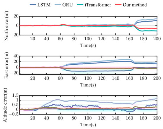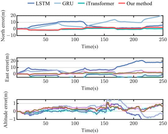 Path #2 has a duration of 200 s and involves straight lines, right-angle turns, and U-shaped bends, making the vehicle’s motion state more complex than that of Path #1. Figure 12 presents the comparison of test tracks and horizontal errors for each method on Path #2. As shown in Figure 12a, the INS trajectory deviates completely from the true path, with an error exceeding 400 m. In contrast, the other methods remain much closer to the true trajectory. The specific horizontal error values are depicted in Figure 12b with a line chart (excluding the INS error, as it is too large and would interfere with the normal display of the other methods). After the first right-angle turn at 60 s, all methods experience some error amplification. However, the iTransformer and our proposed method do not continue to accumulate errors, while the errors for the LSTM and GRU begin to increase further, likely due to the significant impact of the maneuver on the vehicle’s state. A second change in positioning error occurs at 165 s when the vehicle navigates a U-turn. Among all the methods, the proposed method exhibits the smallest horizontal error, demonstrating its ability to maintain high positioning accuracy during complex vehicle maneuvers. The comparison of positioning errors in the east, north, and vertical directions is shown in Figure 13, where our method consistently outperforms the others in all directions. It is worth noting that at the U-turn point, the horizontal positioning error briefly decreases before increasing again. This occurs because the northbound and eastbound prediction results of the neural network fluctuate at the vehicle’s turning point. As shown in Figure 13, the northbound prediction error increases, while the eastbound prediction error decreases around the 165 s mark. This leads to a temporary reduction in the accumulation of horizontal errors at that point. Subsequently, both the northbound and eastbound prediction errors stabilize, causing the overall horizontal error to increase again. In addition, the vehicle typically travels at a low speed during the U-turn, which reduces the complexity of the model’s prediction. This is another reason for the decrease in the horizontal positioning error.