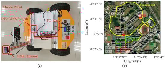 Data acquisition platform and trajectory of datasets: (a) The appearance and electrical connection diagram of the data acquisition platform are provided; (b) The data acquisition path covers the entire route with a strong GNSS signal throughout, lasting a total of 2800 s. Of this, 2240 s are used for the training set, 560 s for the test set, and a 25 s segment is designated as the test path called Path #3.