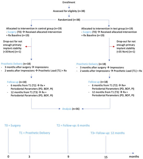 The present study is a single-blind, parallel, randomized, controlled prospective clinical trial, the protocol of which was reviewed and approved by the local University/Hospital ethical committee (N4078) and recorded in public registry of clinical trials (www.clinicaltrials.gov, URL accessed on 27 December 2023—NCT06182670). The study was conducted according to the principles of Helsinki Declaration (as revised in Fortaleza 2013), following CONSORT (Consolidated Standards of Reporting Trials) guidelines. Patients were recruited from April 2021 to May 2023 at the Section of Periodontics, School of Dentistry, Department of Surgical Specialties, Radiological Science, and Public Health of the University of Brescia. The study flowchart is reported in Figure 1.