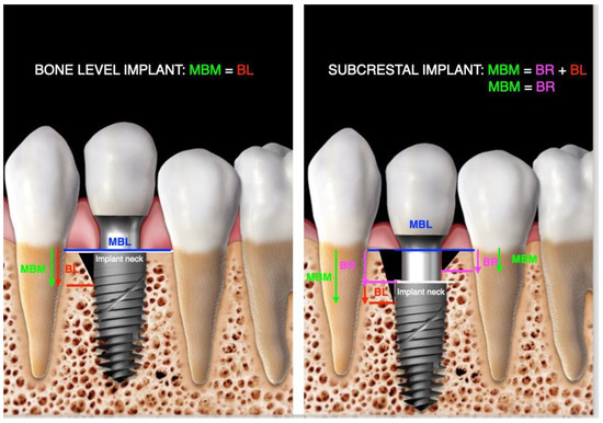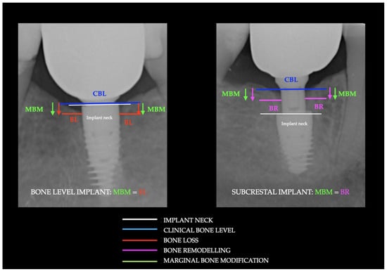 Example of marginal bone level (MBL), marginal bone modification (MBM), bone loss (BL), and bone remodeling (BR) in bone-level and sub-crestal implants.
