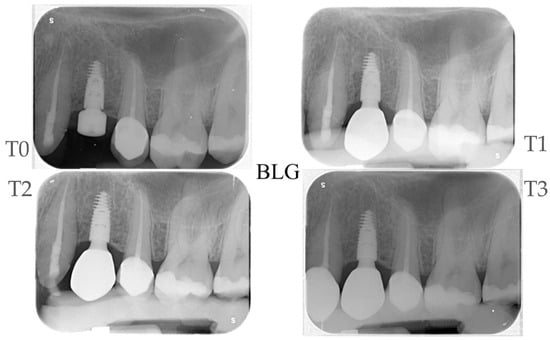 Radiographic control at (T0), (T1), (T2), and (T3) months, respectively. Control (BLG) group.