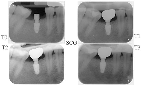 Radiographic control at (T0), (T1), (T2), and (T3) months, respectively. Test (SCG) group.