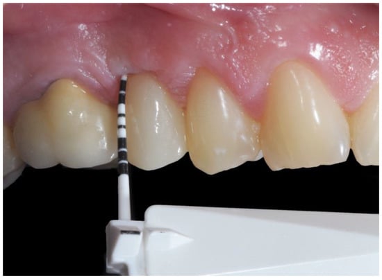Peri-implant soft tissues parameters were collected using a calibrated probe (Vivacare TPS probe Vivadent, Scahaan, Liechtenstein) (Figure 16). The probing depth (PD) was measured at four aspects (mesial, distal, buccal, palatal) following the Mombelli and Lang (1994) classification [39]. The Bleeding on probing (BOP) and Plaque Index (PI) were measured at the implant site by following Trombelli et al. (2018) [40] and O’Leary (1972) classifications [41]. PD, BoP, and PI indexes were measured at 6 and 12 months after restoration delivery (Figure 1).