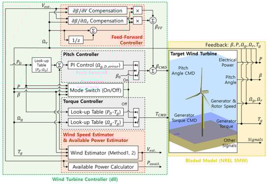 The overall control algorithm of the target wind turbine consists of basic power control, feed-forward control, available power estimation, and wind speed estimation algorithms, with the LQRF control algorithm implemented separately. Figure 1 illustrates the schematic overview of the control algorithm, while Figure 2 shows the schematic overview of the LQRF control algorithm. The designed algorithms for the target wind turbine were structured as external controllers in DLL format and designed to interface with the Bladed program. The following section presents the design details of the feed-forward control, available power estimation, and LQRF control algorithms for verifying the performance of the wind speed estimation algorithm.