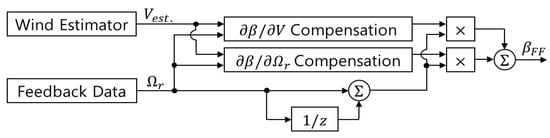 The feed-forward control algorithm adds additional pitch commands as feed-forward terms to the basic closed-loop pitch control of the wind turbine, aimed at reducing the standard deviations of rotor speed and output []. Typically, pitch control in wind turbines is used to maintain rated power output, even when wind speeds exceed the rated speed. In other words, pitch control calculates pitch commands based on generator speed to maintain rated power control by adjusting the generator speed. However, conventional pitch control based on generator speed fails to promptly respond to momentary changes in variable wind speeds. The feed-forward control algorithm addresses this limitation by compensating for instantaneous wind changes, rapidly adjusting pitch angles in response to wind variations. Figure 3 illustrates the schematic of the designed feed-forward control algorithm, indicating the use of rotor speed and estimated wind speed as control parameters. Rotor speed uses measured values as inputs, while estimated wind speed utilizes the output from the embedded wind speed estimator.