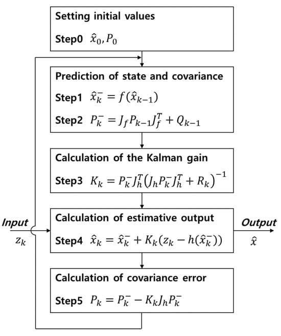 The wind speed estimation based on the extended Kalman filter proceeds through the steps outlined in Figure 4; this process is divided into state prediction, covariance prediction, Kalman gain computation, result prediction, and covariance error computation. In Step 1, state prediction of the nonlinear wind field model is performed, expressed as Equation (8), in which denotes the predicted value of , which is subsequently used in the wind speed estimation step. In Step 2, the covariance error is predicted, expressed as Equation (9), where represents the predicted value of the error covariance , used in the Kalman gain computation step represents the Jacobian of the process, and denotes the process noise covariance. In Step 3, the Kalman gain is computed, expressed as Equation (10), where represents the Kalman gain, denotes the Jacobian of the observation, and signifies the measurement noise covariance. In Step 4, the result based on previously predicted and computed values is predicted using Equation (11), where represents the predicted result; denotes the measurement values including rotor speed, generator torque, and pitch angle; and signifies the rotor system model. Through the above-described steps, the final wind speed estimation is obtained, whereafter, in Step 5 the covariance error is computed, expressed as Equation (12). The computed covariance error is fed back to Step 1, iterating the entire process for each as previously described [,,]. In this study, we designed and applied the method described above to assess prediction accuracy based on different wind speed estimation methods.