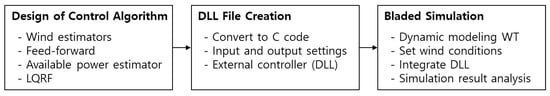 The control algorithms of the target wind turbine, including the feed-forward control, available power estimation, LQRF control algorithms, and wind speed estimation algorithm, were designed using Matlab/Simulink (R2024b) and finalized in DLL format. The DLL format external controller was integrated with the Bladed dynamic simulation program for control performance verification. Bladed simulation, while less reliable than experimental validation, is a performance verification method that can be considered before applying control algorithms to actual wind turbines. Although it may differ slightly from real-world conditions, it is commonly used in research for verifying control algorithms. Figure 5 provides a brief overview of the procedural steps involved in the simulation utilized in this study, the process of which can be divided into control algorithm design, DLL file creation, and simulation using the Bladed program. Specifically, the Bladed simulation involved several detailed stages, including wind turbine modeling, wind condition setting, controller application, and analysis.