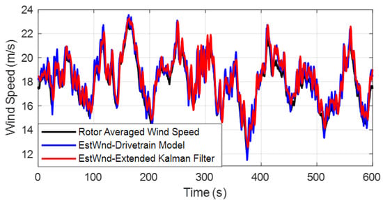 Another method for estimating wind speed utilizes an extended Kalman filter proposed by NREL [] and currently applied in ROSCO to calculate and provide estimated wind speeds. The extended Kalman filter leverages a covariance matrix based on the anticipated 3D wind field and defines a nonlinear rotor model to predict wind speed. For wind speed estimation, the nonlinear continuous time state–space model used in the continuous–discrete extended Kalman filter can be defined as shown in Equations (6) and (7). Here, represents system noise defined as white noise, and denotes measurement noise assumed to be constant white noise.