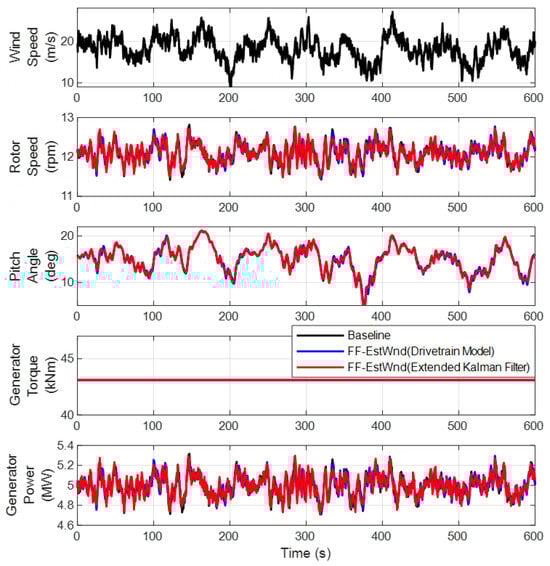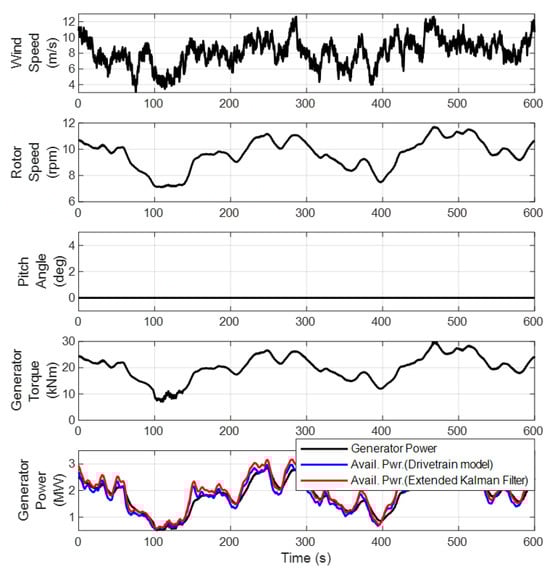 The simulation employing the available power estimation algorithm was conducted using the same model, under simulation conditions of wind speeds lower than the rated wind speed (8 m/s) with a Class A standard turbulence model. The analysis was performed for 600 s in a dynamic simulation environment with different wind speed estimation algorithms applied.