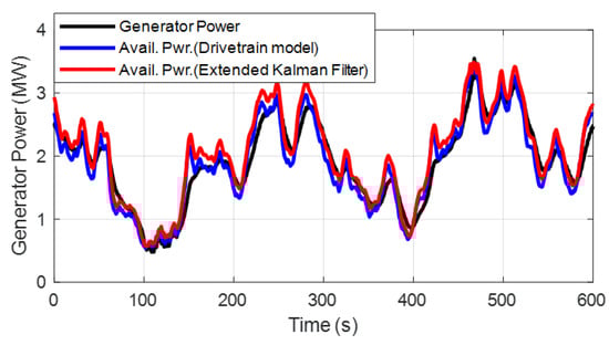 Secondly, additional simulations were conducted using the available power estimation algorithm. The results were evaluated using the means and standard deviations of generator output and estimated available power. The mean errors were −0.58% and 7.29%, and the standard deviation errors were 4.07% and 8.37%, respectively. Furthermore, according to the comparison of the RMSE, MSE, and MAE values, the drive train model-based method showed RMSE, MSE, and MAE values of 0.2061 MW, 0.0425 MW, and 0.1672 MW, respectively, while the Kalman filter method showed RMSE, MSE, and MAE values of 0.2332 MW, 0.0544 MW, and 0.1818 MW, respectively. The simulation results confirmed that the drive train model-based method exhibited relatively superior performance in estimating available power.
