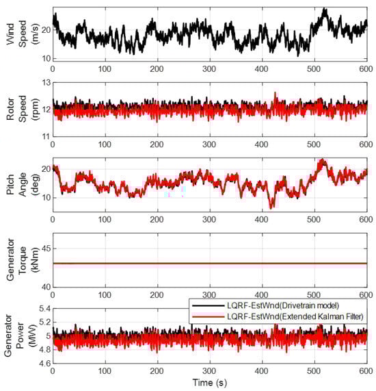 The results of the validation on the LQRF control algorithm using estimated wind speeds according to different wind speed estimation methods are shown in Figure 10. The simulation results depict rotor speed, pitch angle, generator torque, and output. The black line represents the simulation results of the LQRF control algorithm based on the drive train model method, while the red line denotes the simulation results based on the extended Kalman Filter method. Although operational performance appears similar, differences in the standard deviations of rotor speed and output can be observed. Table 6 presents the comparison results of mean and standard deviation for rotor speed and generator output. Slight differences in operational performance can be observed depending on the applied wind speed estimation method. For the LQRF control algorithm using the drive train model method, the standard deviations of rotor speed and generator output are found to be 22.83% and 20.75% lower, respectively, compared to when the Kalman Filter method is applied. According to the simulation results, the performance of the LQRF control algorithm using the drive train model method appears relatively superior. According to the simulation results, although the same control algorithm was applied, the drive train model method showed greater reductions in the standard deviations of rotor speed and generator output, leading to the conclusion that the accuracy of the estimated wind speed is crucial, even when modern control algorithms are applied.