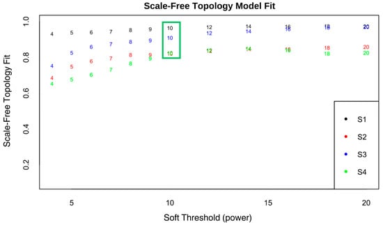 In WGCNA, gene expression matrices are normalized and outliers are removed from the data [,]. This results in filtered data (Figure S1) with outliers removed (Figure S2). Following this, 26,434 common genes are used to build the networks. The large number of genes in the analysis suggests robust analysis [,,,]. Figure 1 presents the scale-free topology fit index as a function of soft threshold (β) values (1–20). From this figure, the point at which the fit stabilized was at β = 10. Thus, β = 10 was selected to analyze all the datasets since this may promote a robust gene network with biologically relevant cluster construction.
