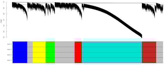 In WGCNA, meta-analysis consists of mapping module eigengenes from different datasets onto a reference dataset. This influences the robustness of the network and clustering resolution based on TOM 23. For this study, the ccRCC S1 dataset was selected as the reference. It also represents the early stage of ccRCC. A soft threshold power of β = 10 was used to construct the adjacency matrix. The S1 dataset was selected as the reference for the analysis, and the identified modules are displayed in Figure 3. This dataset’s expression profiles may provide a basis for understanding ccRCC S1 to S4. The sensitivity plots (Figure S3) also suggested that these module sets were stable even as sensitivity increased, presumably because of either strong gene correlations or fewer significant clusters. WGCNA identified seven gene co-expression modules as follows, each with a distinct color and a total number of genes: blue (2500 genes), brown (2497 genes), red (1242 genes), grey (2500 genes), green (1557 genes), yellow (2320 genes), and turquoise (2500 genes).