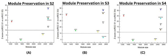Module preservation in the ccRCC S1 network compared to (A) S2, (B) S3, and (C) S4 is indicated by Zsummary values. A Zsummary > 10 indicates strong preservation values.