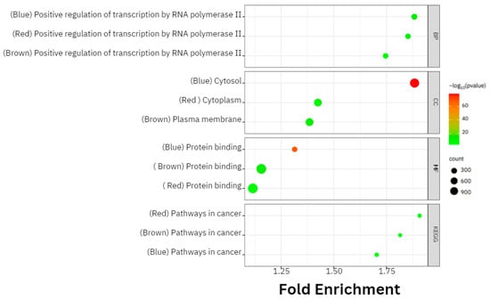 The datasets were analyzed using eigengene-based connectivity (kME) by correlating the expression profile of each gene with module eigengenes. The genes were ranked by their kME values. The top genes were selected for functional analysis using DAVID GO categories (BP, CC, MF) and KEGG pathways. Enriched GO and KEGG terms for each module are provided in Table A1, Table A2, Table A3, Table A4 and Table A5, and the top terms are presented in Figure 5. Blue, red, and brown modules are mainly involved in transcription regulation. These modules are active in the cytosol, plasma membrane, and cytoplasm and are all associated with protein binding. KEGG pathway analysis indicated that these modules participate in pathways related to ccRCC through inflammatory pathways.