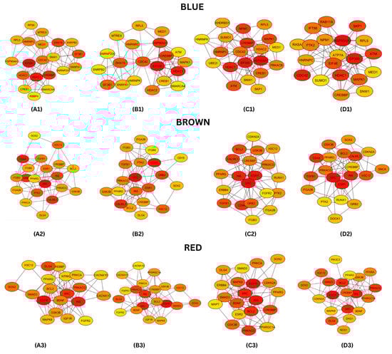 Top 20 hub genes of 3 highly preserved modules (blue, brown, and red) processed using (A1–A3) MNC, (B1–B3) degree, (C1–C3) closeness, and (D1–D3) betweenness centrality algorithms of Cytoscape.