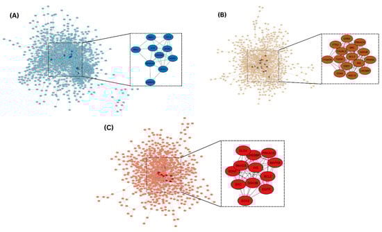 Protein–protein interaction networks of the overlapping hub genes in the 3 modules (A) blue, (B) brown, and (C) red.