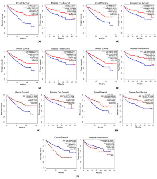 Kaplan–Meier survival curves for overall survival (OS) and disease-free survival (DFS) of hub genes with p < 0.05 in KIRC patients using GEPIA: (A) BCL2, (B) EP300, (C) CREBBP, (D) SMAD3, (E) MAPK1, (F) MAPK8, and (G) SOX2.