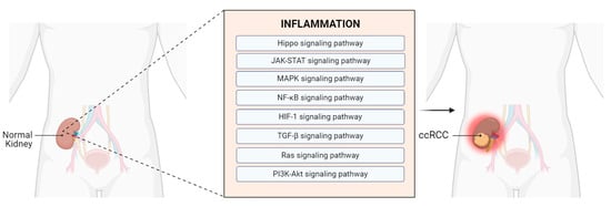 Renal cell carcinoma (RCC) accounts for 3% of all cancers worldwide. The clear cell type is the most common RCC. It is responsible for 80% of all RCCs [,]. A clear cell appearance of the tumor cells, caused by the accumulation of lipids and glycogen in the cytoplasm, is the characteristic feature of ccRCC []. RCC is categorized according to the TNM classification system. The cancer stages are categorized in terms of tumor size, degree of lymph nodes, and metastasis []. In the cases of RCC, both Stage 1 (≤7 cm) and 2 tumors (≥7 cm) are still confined in the kidney. On the other hand, Stage 3 has already spread to the nearby parts of the kidney or lymph nodes, and Stage 4 indicates metastasis to distant sites [,,,,]. In terms of survival rates of patients, stage 1 has 90.4%, stage 2 has 83.4%, stage 3 has 66.0%, and the rate is 9.1% for stage 4 [,]. The development of ccRCC mutations or loss of the VHL gene disrupts the oxygen regulation response, which accumulates hypoxia-inducible factors such as HIF-1α and HIF-2α. This, in turn, activates certain genes like vascular endothelial growth factor (VEGF), which contribute to the physiology of the tumor and promote cancer [,,,]. Inflammation may also worsen the ccRCC [,,,] since significant leukocyte infiltrates, including CD8+ and CD4+ T cells, are linked with higher tumor grade and poor prognosis in ccRCC [,].