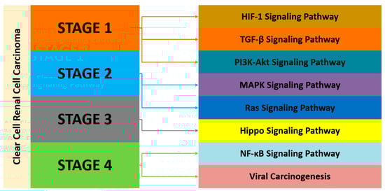 KEGG pathways associated with ccRCC. Arrows indicate that the specific signaling pathways are present at a certain stage.