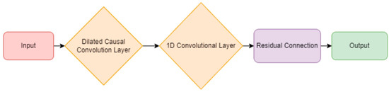 Residual connections: To facilitate training deeper networks, the TCN employs residual connections that add the input to the output of each convolutional block. Residual connections refer to shortcuts that connect the input of a layer directly to the output of a later layer, bypassing one or more intermediate layers. It is used for the model to learn the residual mapping, which means the difference between the output and the input rather than the whole transformation. Residual connections make it easier to train deep networks by enabling gradients to flow more directly through the network; that is, their use reduces the risk of vanishing gradients. Residual connections help stabilize the network and prevent overfitting by enabling some of the information from the previous layers to pass unchanged.