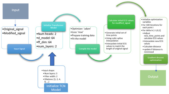 We examined the effectiveness of a TCN model and a transformer-based model in our experimental setup for time-series signal optimization (Figure 5). The network consists of three 1D convolutional layers. Each layer has 64 filters. The size of the convolutional kernel is 3, and the ReLU activation function is applied to introduce non-linearity ‘same’ padding, which is used to ensure the output length matches the input length. A final 1D convolutional layer with a single filter and a kernel size of 1 is applied to produce the output. The output layer is linearly activated to allow the prediction of continuous values. The model is then trained on the original signal for 25 epochs. However, the loss stabilized at 10 epochs. New ECG values for the modified signal are computed at the initial time points using cubic spline interpolation. The obtained ECG values are interpolated to the length of the original signal so that they can be compared directly. Afterward, the defined architecture is used to build the TCN model, which is then compiled with the Adam optimizer and mean squared error loss function (Figure 6). For each time point, small perturbations (−1, 0, 1) are tested to see which one will go in a direction that conveys a reduction in the distance—the MSE of the original and interpolated signals. If a perturbation returns a smaller distance, the time point is updated. This is repeated for a number of iterations, 100 in this case.