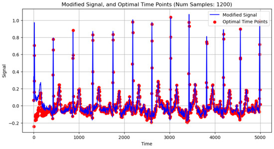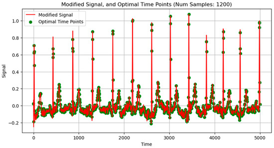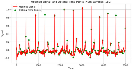 Figure 9, Figure 10, Figure 11 and Figure 12 illustrate the optimal time points selected for resampling the ECG signal of Person_30 in the database at two extremely different sampling rates: 18 sps and 120 sps. Figure 9 and Figure 11 demonstrate the distribution of optimal time points when the signal is reduced to 18 sps for both TCN and transformer models, while Figure 10 and Figure 12 present the optimal time points for a higher rate of 120 sps for both models, respectively. These figures highlight how the sampling density affects the selection of time points to ensure the reconstructed signal maintains high fidelity to the original.