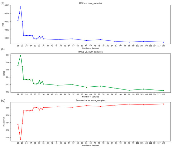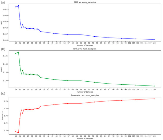 Scatter plot for transformer model showing actual outcome: (a) MSE vs. number of samples; (b) RMSE vs. number of samples; (c) Pearson’s r vs. number of samples.