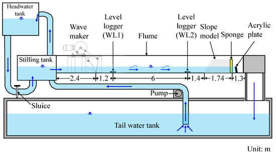 Setup of the flume test for wave erosion on slope. (The blue arrow indicates the direction of water flow.)