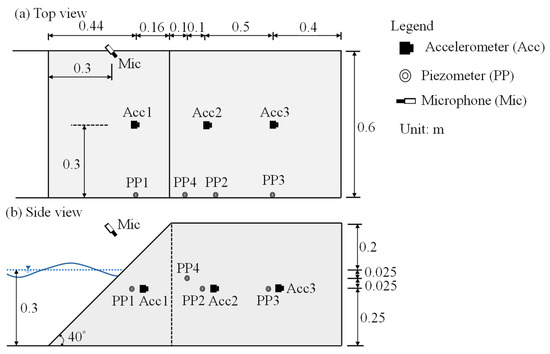 The layout of sensors is as shown in Figure 2. This study used 3 accelerometers (Acc 1–3) and 4 pore pressure gauges (PP1–4) to record the seismic signals and pore pressure of the slope models. The wave level is measured by two wave gauges (WL1, WL2), positioned 7.4 and 1.4 m away from the toe of the slope model, as shown in Figure 1. We also placed a microphone (Mic) above the surface of the slope model to record the acoustic signals of slope erosion and slide/collapse caused by waves. The specifications of the accelerometers and the microphone are listed in Supplementary Tables S1 and S2. In addition, 3 cameras were set up during the tests to record the front, top, and side views of the slope model.