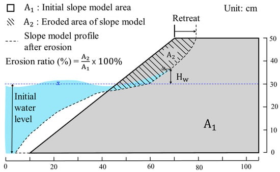 Figure 3 illustrates the assessment methods for erosion ratio, the run-up height of the wave (Hw), and retreat, as described by Peng et al. [26]. A1 represents the initial surface area of the slope before a test, while A2 represents the area of the slope materials that has been eroded within the initial slope profile. The run-up height of the wave is the difference in elevation between the highest point reached by the wave as it climbs up the slope and the initial water level. Retreat refers to the reduced distance of the crown of the slope model.
