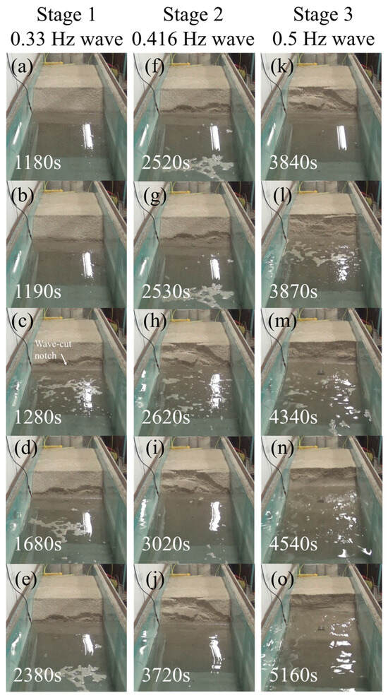 During Stage 1 (1180 s–2380 s), the slope was eroded by 0.33 Hz waves. The erosion range of the Stage 1 waves was small due to the highest run-up height of wave (Hw) being only about 2.1 cm. The slope damage was limited to the area near the water, forming a wave-cut notch (Figure 4c). Also, because the erosion range of the waves was small, the wave-cut notch did not continue to expand during Stage 1 (Figure 4d,e).