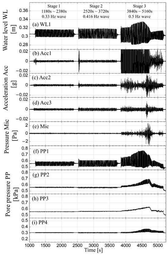 Original data: (a) wave water level, WL1; (b–d) acceleration, Acc1~Acc 3; (e) sound pressure, Mic; (f–i) pore pressure, PP1~PP4 (the amplitude of Acc 1 during Stage 3 is out of range due to Acc 1 being exposed on the slope surface).
