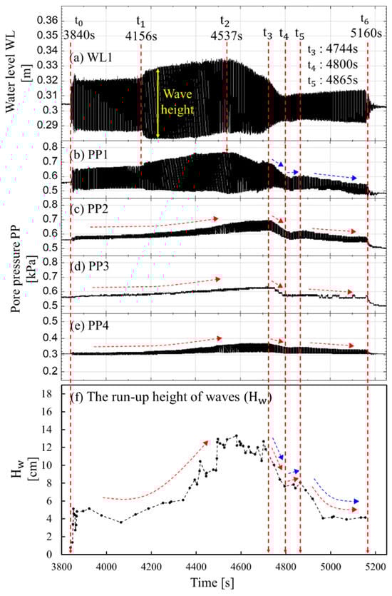(a) Wave water level, WL1; (b–e) pore pressure (PP1–PP4); (f) run-up height of wave during Stage 3 (3800 s~5250 s). (The arrows show the tread of the data. The black dots represent “Hw” data measured from test video snapshots, and they connected by the black dashed line.)
