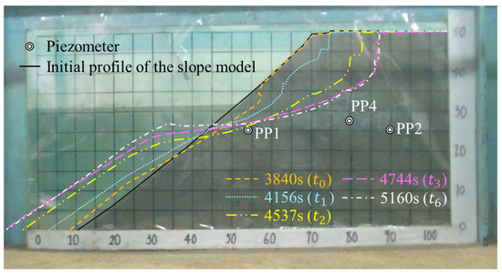 By observing the pore pressure PP1, which is closest to the slope face, and the variation in Hw from t3 to t6, we found similar trends, as indicated by the blue arrows in Figure 6b,f. It can be deduced that the changes in wave height no longer directly affect the pore pressure at PP1. Instead, Hw influenced the pore pressure of PP1 more significantly. This shift is likely because wave erosion caused the slope to deform progressively during t0 to t3 (as shown in Figure 7), leading to the dissipation of wave energy. Therefore, as Hw decreases, the water level above the piezometer PP1 also decreases, thereby decreasing the pore pressure of PP1.
