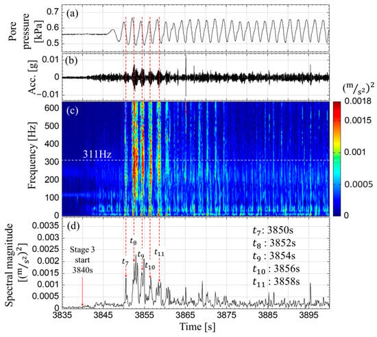 Duration: 3835 s~3900 s in Stage 3. (a) Pore pressure, PP1; (b) acceleration, Acc 2; (c) time–frequency spectrum; (d) spectral magnitude profile of 311 Hz (The timing of t7 to t11 represents local slides of the slope model).