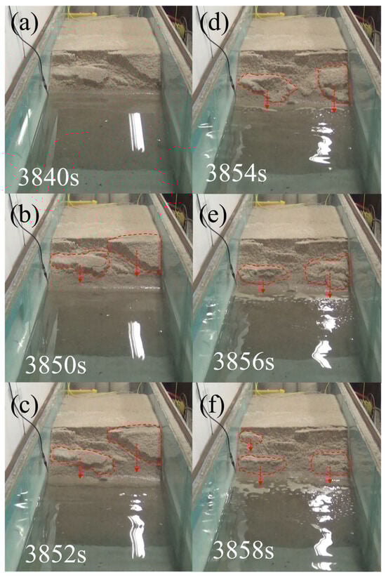During Stage 2 (2520 s–3720 s), the erosion range of the 0.416 Hz waves was slightly larger (the highest Hw was about 3.4 cm), which enlarged the wave-cut notch (2528 s–2562 s), triggered landslides, and caused the slope to retreat (Figure 4h). However, the erosion range of the waves was still small during Stage 2, so many soil masses remained on the slope after the landslide and were not washed away by the wave backwash (Figure 4i,j).