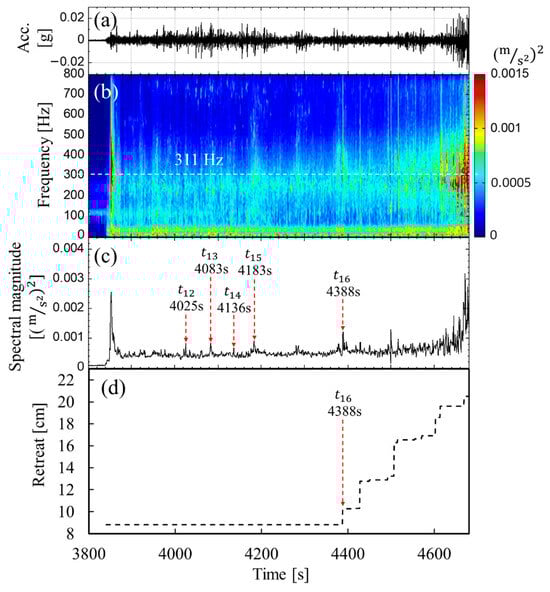 Duration: 3800 s~4700 s in Stage 3. (a) Acceleration, Acc 2; (b) time–frequency spectrum; (c) spectral magnitude profile of 311 Hz; (d) retreat (the timing from t12 to t15 and t16 represents sliding and collapsing of the slope model).