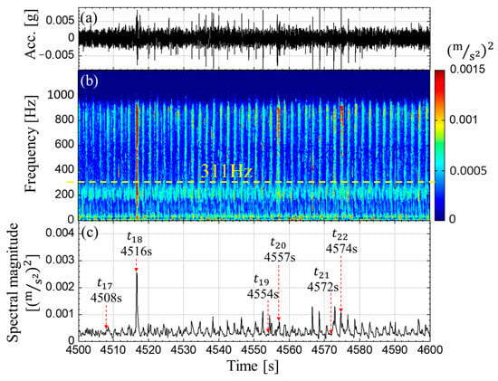 Duration: 4500 s~4600 s in Stage 3: (a) acceleration, Acc 2; (b) time–frequency spectrum; (c) spectral magnitude profile of 311 Hz (the red arrows represent the timing of collapse).