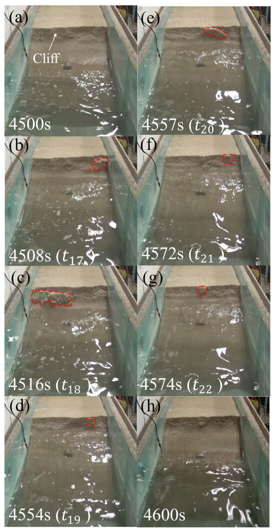 Figure 12 presents the seismic signal Acc 2, time-frequency graph, and spectral magnitude profile from 4500 s to 4600 s. During this period, the force of the wave impact on the slope was substantial, and significant sounds of wave impact can be heard from the experimental video. Figure 12b shows faint blue vertical energy traces in the time-frequency spectrum, which are caused by wave impact on the slope. Figure 12c marks the times of slope collapse (t17–t22) that were observed from the test video, with spectral value peaks at t18, t20, and t22. The collapses at t17, t19, and t21 are hard to recognize from Figure 12c, which may due to the very small energy and the characteristic of the seismic frequency content of the collapses. Corresponding photos from the experiment (Figure 13c,e,g) show that the upper cliff of the slope had larger collapses at t18 and t20, resulting in greater vibrations. The collapse event at t22 was recorded due to the falling soil mass being closer to the sensor Acc 2. There are no peaks in the spectral values at t17, t19, and t21, possibly because the volume of the collapse was small, or the locations of the falling soils were too far from the sensor to be reflected in the seismic signal. During the rapid retreat of the slope, the force of the wave impact was stronger, creating many energy traces in the time-frequency spectrum (Figure 12b), making it more challenging to identify collapse events. However, during periods of wave swash, there are fewer energy traces from wave impact on the slope; therefore, the collapse event can be identified. The processes of t17–t22 collapse can be viewed in Video S5.